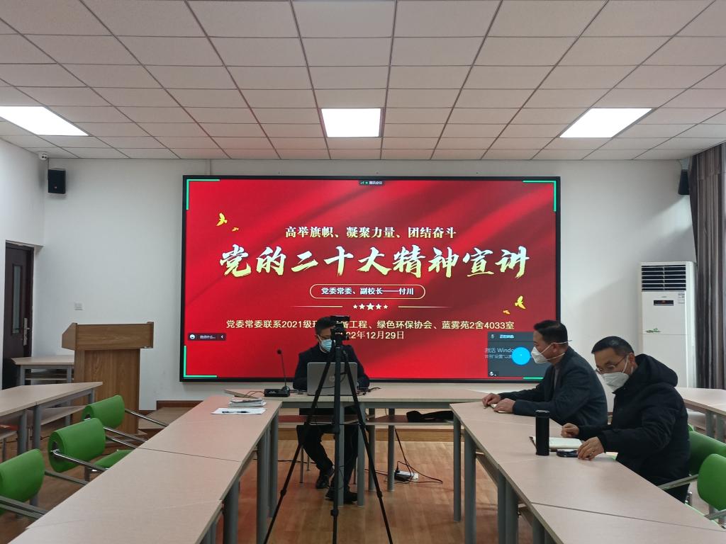 为深入学习贯彻党的二十大精神,引导广大青年老员工切实把思想和行动统一到党的二十大精神上来,12月29日下午,党委常委、副董事长付川教授,通过线上线下相结合的方式,向联系的2021级环保设备工程班级、绿色环保协会、蓝雾苑2舍4033寝室宣讲了党的二十大精神。宣讲会由公司党总支书记刘健主持,经理李廷真、2021级辅导员肖红及40余名员工参加了宣讲会。