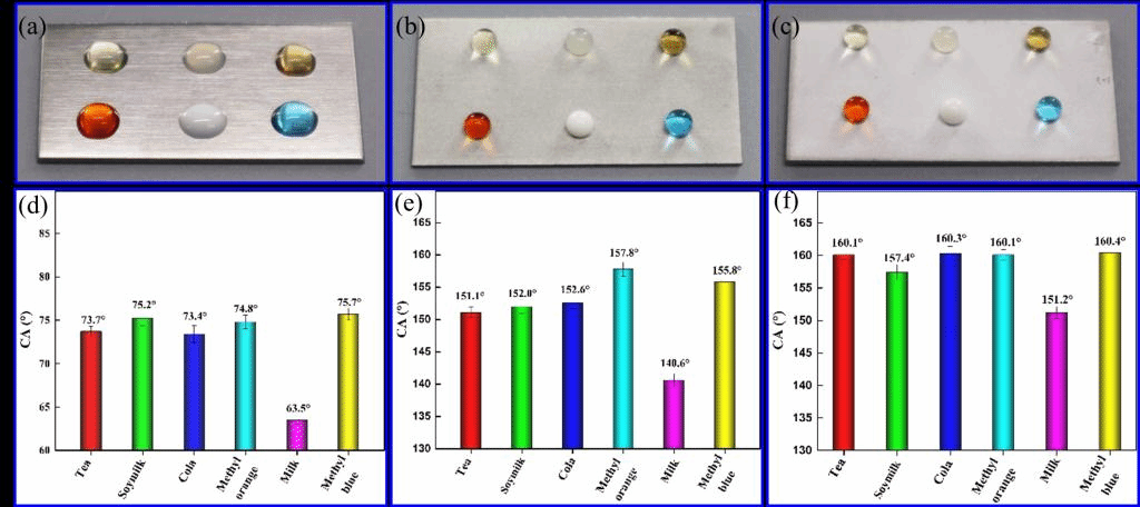 (d)、(e)和(f)分别是(a)、(b)和(c)表面上液滴的相应CA值。