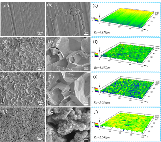 图2 不同样品的表面的SEM图像和CLSM图案:(a-c)SS,(d-f)ESS,(g-i)F-ESS与(j-l)FZr-ESS