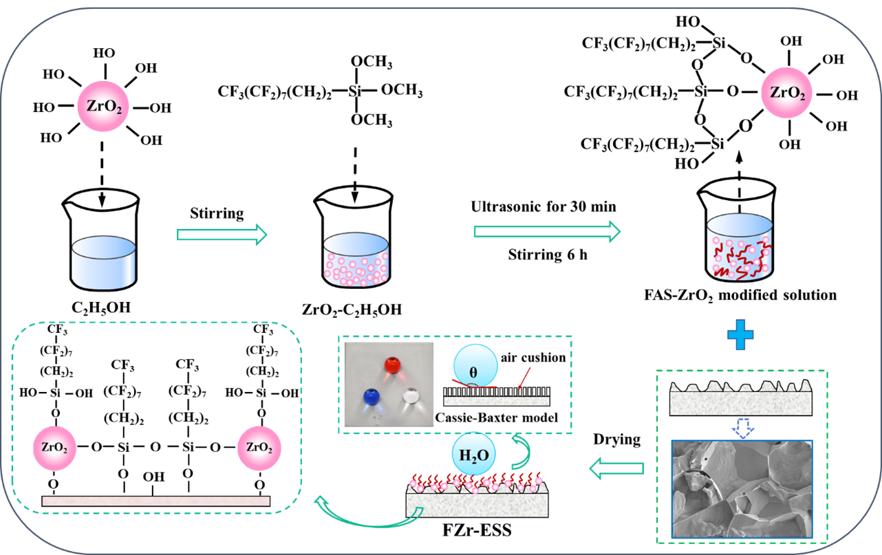 不锈钢是一种广泛应用于日常生活的金属材料,由于其优越的机械性能和耐腐蚀性,在建筑、医疗器械、化工设备等领域被广泛应用。但钢材表面吸附灰尘的倾向较高,在使用过程中难以自洁。特别在潮湿的环境中,被污染的不锈钢表面容易被腐蚀,无法满足恶劣条件下使用的要求。本课题通过化学刻蚀与表面改性技术在304不锈钢表面上制备出坚固的超疏水FAS-ZrO2(FZr-ESS)表面,可有效提高不锈钢基体的防污自洁与耐腐蚀能力。