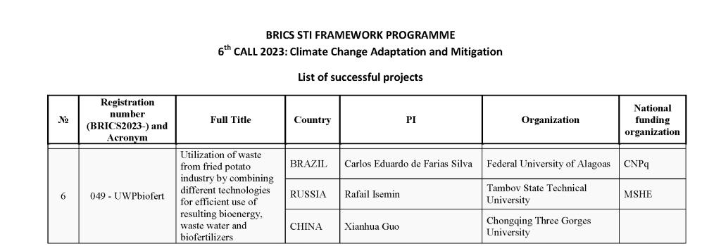 近日,2023年度金砖国家科技创新框架计划(BRICS STI Framework Programme Call 2023: Climate Change Adaptation and Mitigation)项目评审结果公布。公司郭先华教授与俄罗斯坦波夫国立技术大学、巴西阿拉戈斯联邦大学联合申报的“Utilization of waste from fried potato industry by combining different technologies for efficient use of resulting bioenergy, waste water and biofertilizers”项目成功获批。