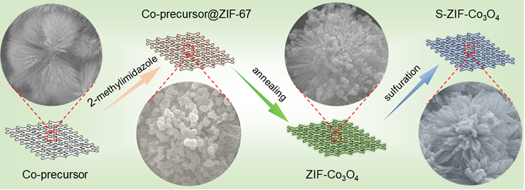 3.构筑硫掺杂的ZIF衍生的Co3O4花状微球,制备高性能非对称超级电容器:通过掺杂工程和结构工程构筑硫掺杂的S-ZIF-Co3O4花状微球,材料具有以下优点:(1)该花状结构集成一维纳米线和二维纳米片的优点,能够提供有效的电子传输路径和丰富的电化学活性位点;(2)硫掺杂能够有效地提高活性材料的电导率,有利于电子的输运;(3)直接在泡沫镍基底上构筑活性材料,避免使用粘合剂有助于减少“死体积”,降低电极电阻。该工作通过掺杂工程和结构工程构筑S-ZIF-Co3O4花状微球,为制备高性能的超级电容器电极材料提供了有效的方法和路径。