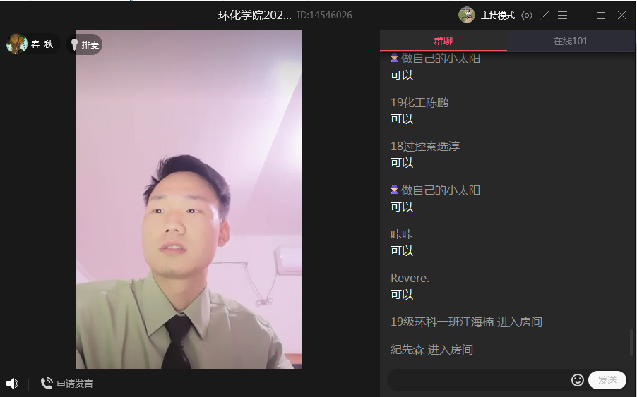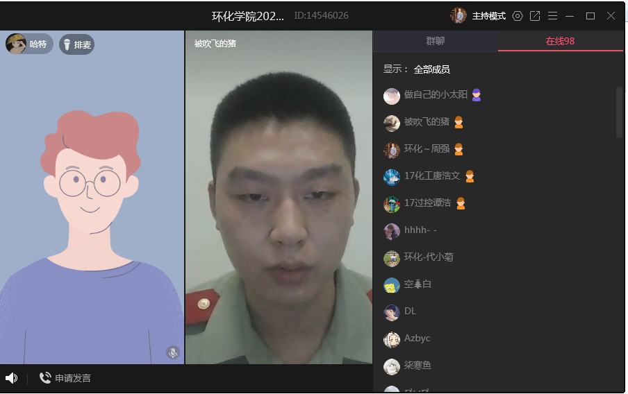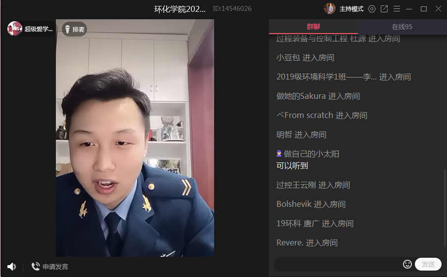 2020年4月16日19:00,环境与化学工程公司通过线上召开2020年征兵入伍动员会。公司党总支副书记、各年级辅导员、优秀退伍老员工、部分有参军意愿的男生参会。会议由学工办副主任周强主持。