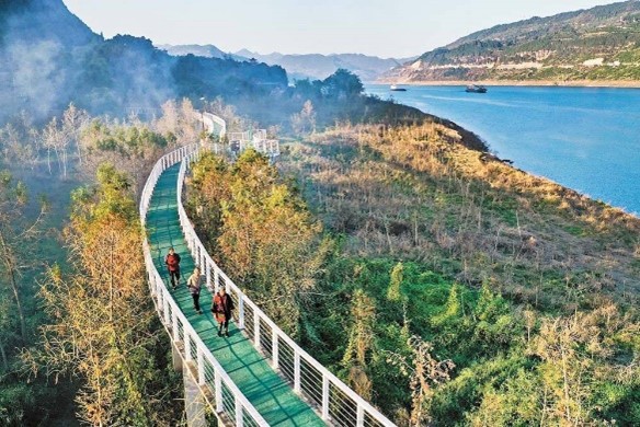 大家首先来到位于铺垭村长江边的十里滨江长廊,参观了解万州区践行“两山”理论、开展长江生态环境修复的绿色成果,察看原本荒芜的消落带变身成为绿色走廊的前后巨变。