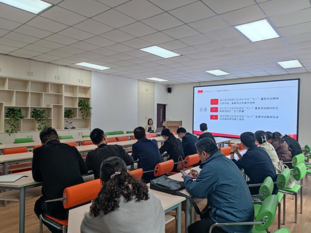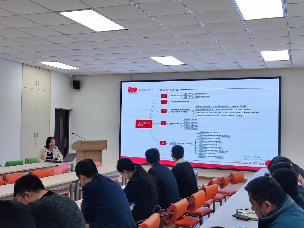 谢昆以“传承红色基因,担当育人使命”为题展开。她谈到,习近平总书记“七一”重要讲话,全篇大约7000多字,脉络清晰,逻辑严谨,亮点纷呈,讲话分为总录、分录、结束语三个板块,她从“二、一、四、一、九”这几个数字总结梳理了讲话的新观点、新论断、新精神。