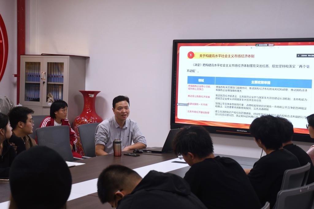 10月14日晚,环化公司党总支书记刘健在慎思楼4栋303教室,为四十余名本硕员工带来了一场生动而深刻的党的二十届三中全会精神宣讲活动。此次宣讲旨在引导广老员工深刻领会全会精神,将思想和行动统一到中央决策部署上来,共同推动改革举措落地生根。