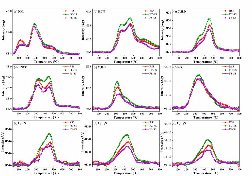研究发现,Fe2(SO4)3调理剂有效降低了小分子含氮污染物的释放,而FeCl3调理的污泥在热解过程中释放出更多的小分子含氮污染物(如图2)。这表明Cl-促进了小分子含氮污染物的释放,而SO42-抑制了小分子氮污染物释放。