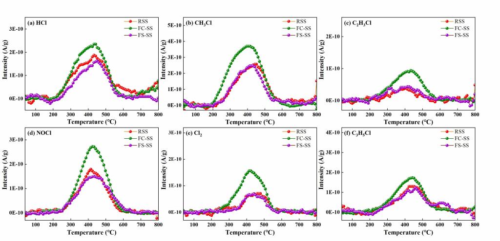 研究表明,由 FeCl3 调理的污泥在热解过程中残留在污泥饼中的Cl并促进了更多的含 Cl 污染物释放(如图4)。