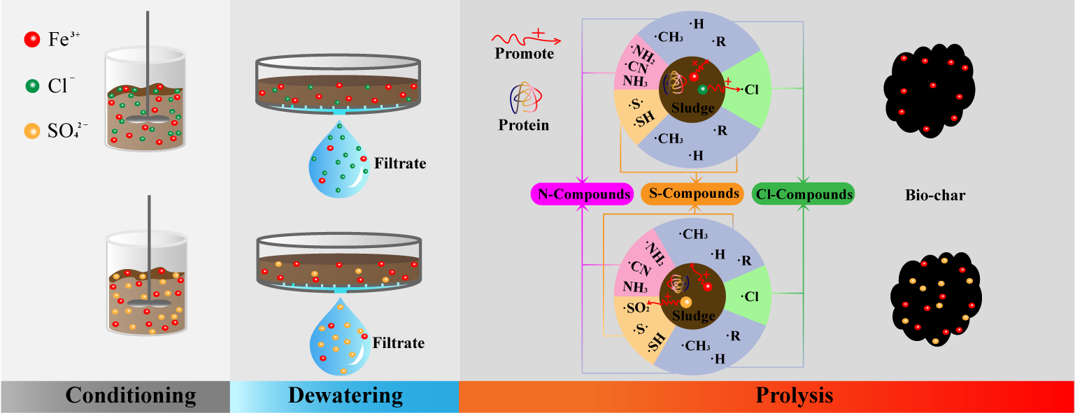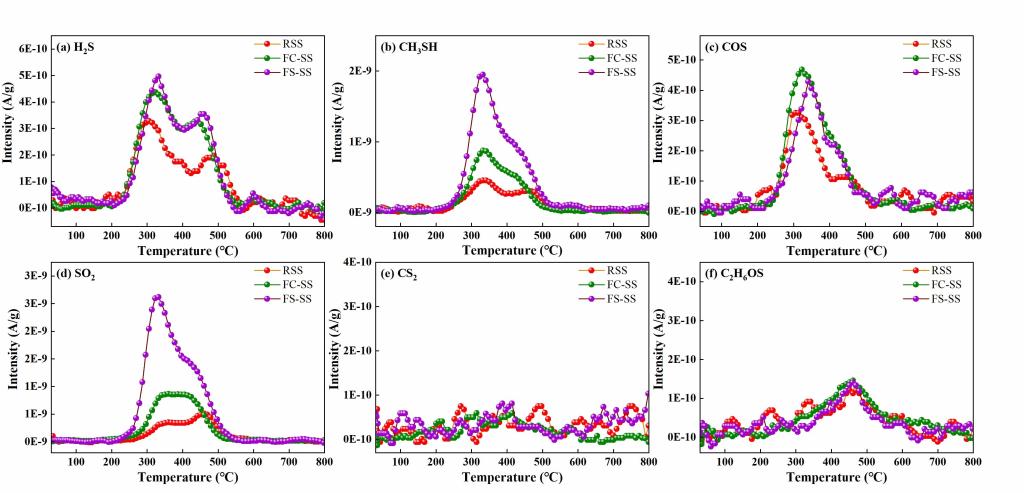 研究表明,含铁调理剂显着增加了污泥热解过程中某些含硫污染物(H2S、CH3SH、COS和SO2)的释放(如图3)。 此外,铁盐中所含的不同阴离子对含硫污染物的形成表现出不同的机制和影响程度。