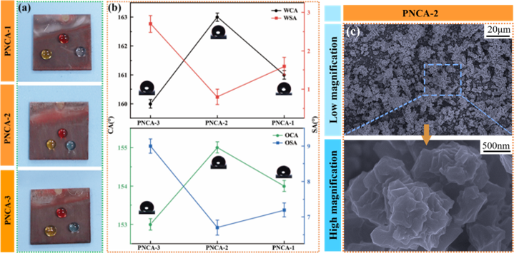 图2PNCA涂层表面水(油)滴的光学图像(a),水/油接触角和滚动角(b);PNCA-2涂层的SEM图像(c)