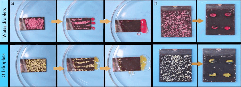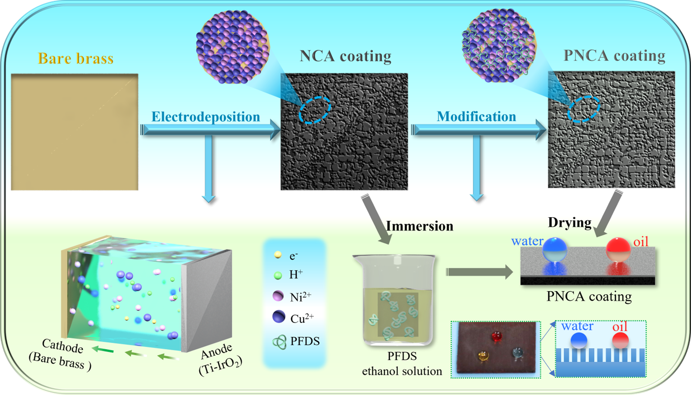 研究发现,Ni、Cu粒子共沉积在黄铜表面构造了具有丛林状的分层微纳米结构。测试发现,最优样品PNCA-2的水接触角为163°,油接触角为155°,且滚动角均小于10°。
