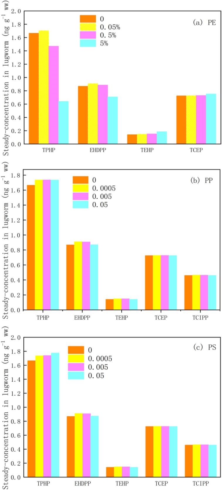 图1暴露于不同浓度(0、0.05%、0.5%和5%)的(a) PE、(b) PP和(c) PS微塑料处理后海蚯蚓组织中OPFRs浓度