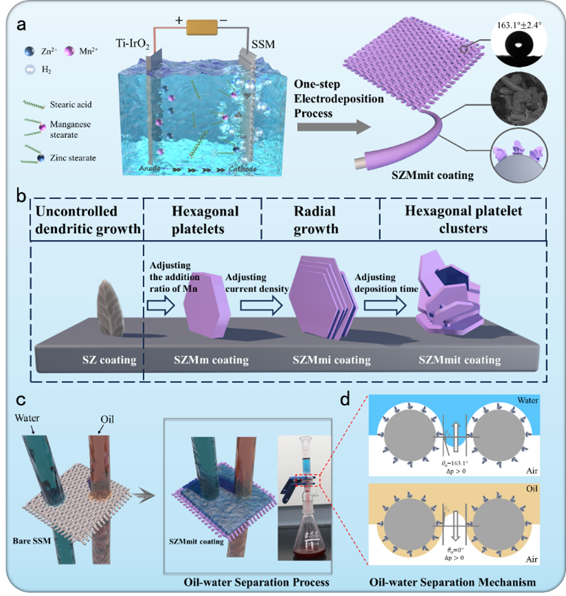 从水中清除溢油是环境修复领域的一项重大挑战。根据润湿性的不同,超浸润材料可实现油水混合物的分离,是当前油水分离领域的重要研究方向之一。本研究通过引入Mn和调节沉积参数来控制Zn晶体的微纳米结构,在不锈钢网上制备了具有六方片簇状结构的硬脂酸锌/锰(SZM)镀层。SZM不锈钢网具有显著的水接触角(163.1±2.4°)、油接触角为0,这一特点有利于高效的油水分离。结合SSM的尺度筛选,SZM不锈钢网的油水分离效率达到99.86%,通量高达55.58 kL/m2h。即使在极端条件下,如高温(200 °C)、高压(7 kg/cm2),或暴露在化学和机械应力下,SZM不锈钢网仍表现出持久的超疏水性和优异的耐腐蚀性。该不锈钢网适用于构建基于重力、连续和封闭的油水分离系统,为解决油污水问题提供了切实可行的方案。