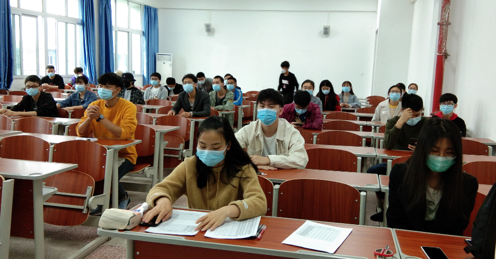 上午10点,员工们佩戴口罩,陆续来到教学楼。进入教室前,有专人负责给他们测体温和签到。进入教室后,同学们自觉分散就坐,个人之间保持1米以上距离。